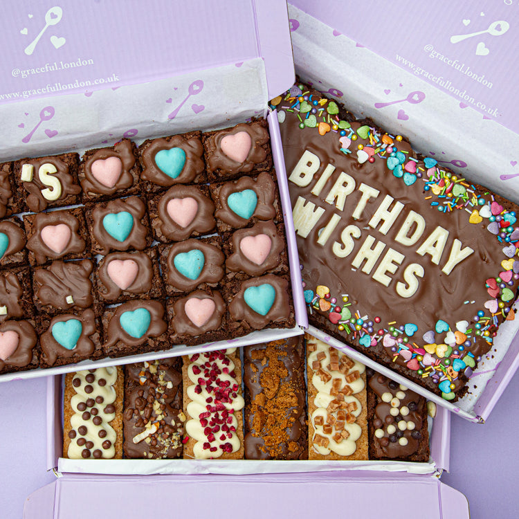 Make your sweet moments even more special with our delicious personalised brownies and blondies crafted just for you. Customize your treats with names, messages and chocolate icons for a unique and personal experience.