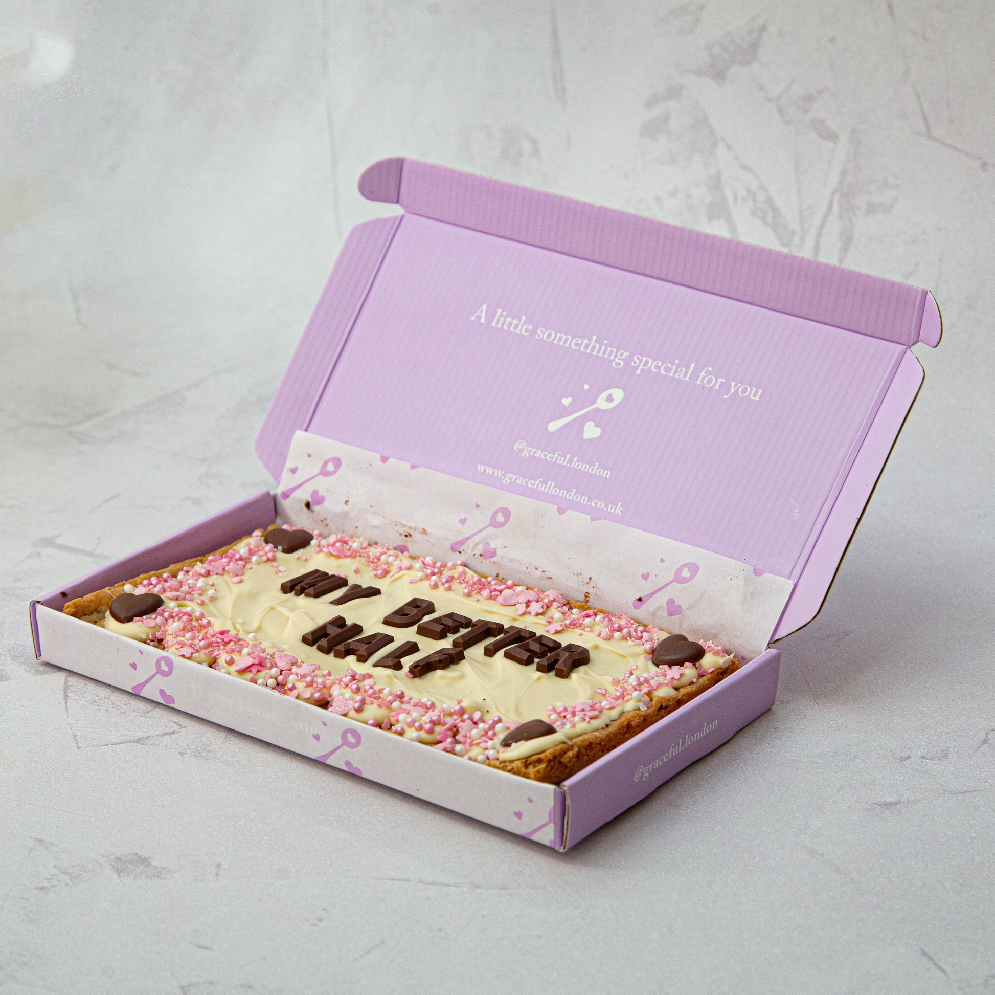 Unwrap and experience the joy of our brownie/blondie slabs with that extra special personal touch. Pick your favourite flavour, choose your sprinkles and chocolate icons, and pick from our popular graceful messages. Our boxes are perfect for sharing or savouring solo.