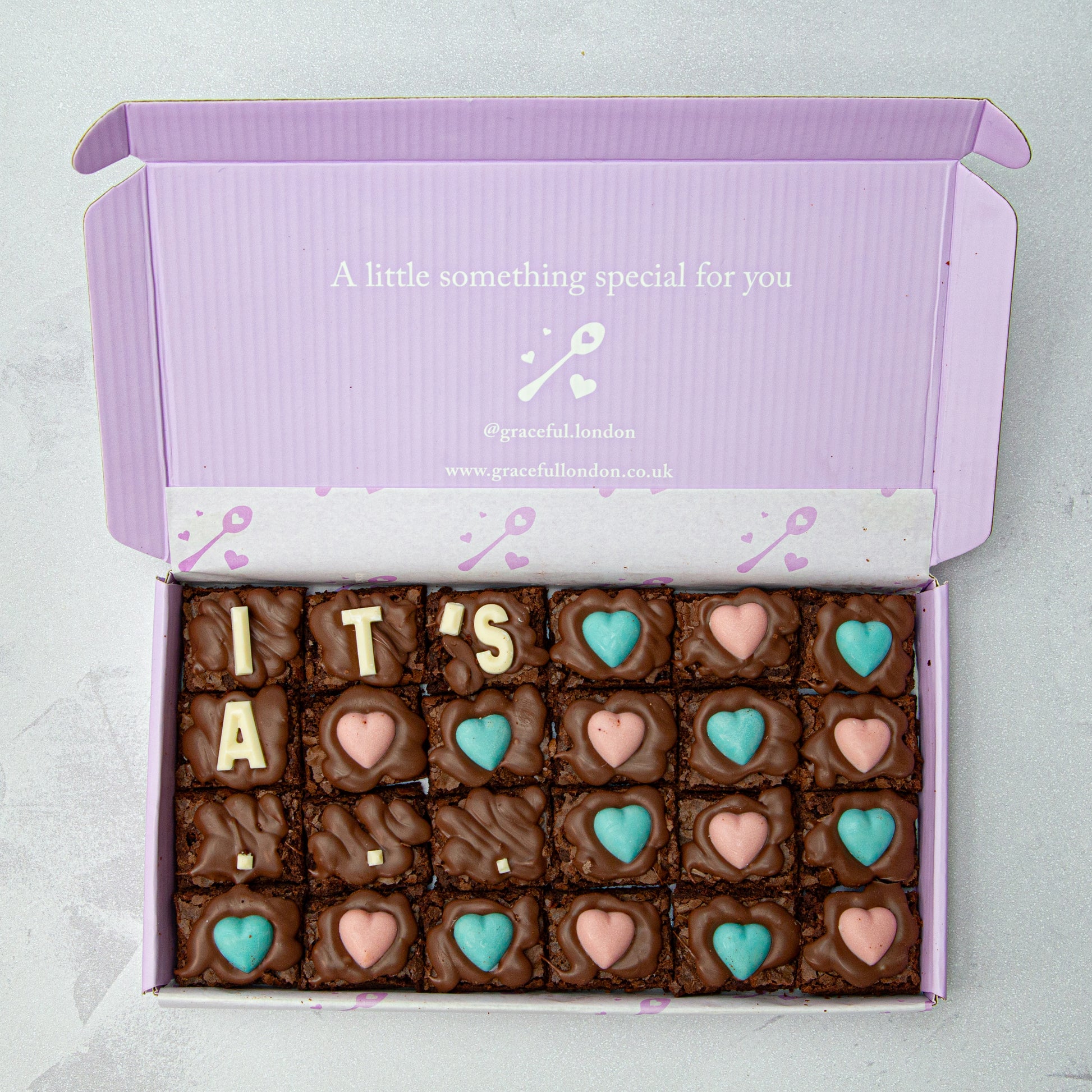 Brownie boxes are topped with Belgian milk chocolate and white chocolate pink & blue hearts. Blondie boxes are topped with Belgian white chocolate and white chocolate pink & blue hearts.